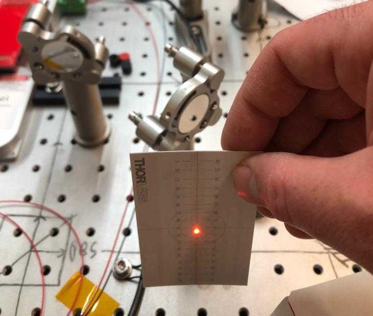 - 21 Jun 2023 – A long time between updates, but some success in the Solid-State Lab with our first generation of 606nm light! Produced via sum-frequency generation of 995nm and 1550nm in a nonlinear crystal in a fiber-coupled module. Currently performing to specification with around 100mW each of the input lasers to produce about 12mW of orange light. Next steps are to increase the input powers to get near half a Watt of orange light, while also building up our free-space orange optical set-up to probe the 606nm transition of praseodymium ions doped into crystalline hosts. Watch this space!