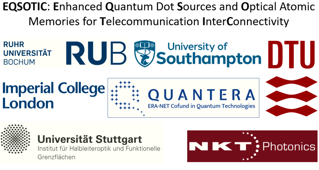 - 18 Dec 23 – Exciting news! The EQSOTIC project has been recommended for funding under the Quantera framework call 2023. The consortium comprises members across Germany (Stuttgart and Bochum), Denmark (DTU and NKTPhotonics) and the UK (ICL and Southampton), and we are the coordinating partner of the consortium. This project builds on our successful results of interfacing quantum dots and memories, with the goal of enhancing the performance of both devices and interconnecting them over delpoyed optical fiber. Keep tuned for updates! Official announcment on the quantera website here.