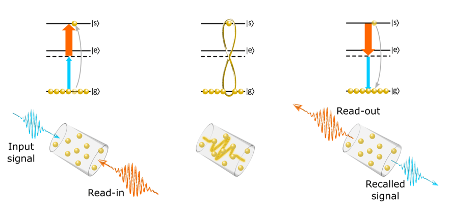In the context of local quantum networks, a high repetition rate is desirable and therefore broadband realizations of quantum memories are required. Off-resonant Raman-based memory protocols are capable of broadband operation – e.g the Raman quantum memory (based on the Raman effect phenomenon, discovered and pioneered by Sir Chandrasekhara Venkata Raman). The memory is characterised by two optical fields, signal and control, that are in a lambda configuration. The fields are detuned off single-photon resonance but are on two-photon resonance. The strong control pulse dresses the atomic system providing a broad virtual state to which the signal field couples efficiently to, with the bandwidth being determined by that of the control pulse. A single photon can then be mapped to the entire ensemble, being stored in a collective coherence or spin wave, which is then read out later with a second control pulse.